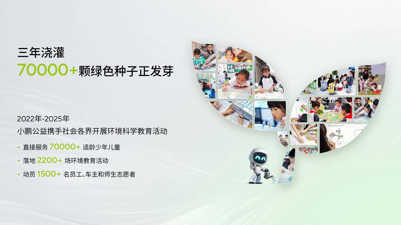 2023年,小鹏公益召集200多名小鹏汽车员工和车主志愿者,在汽车、双碳、环保等领域专业机构的支持下,将小鹏汽车在智能驾驶、三电技术、绿色制造、飞行汽车等方面的积累,变成孩子们能看懂的、喜欢玩的、在手边的科普产品及课程「低碳出行家」,支持家庭、学校和社会组织等开展环境科学教育活动。截至2025年3月,仅「低碳出行家」项目已在全国累计开展超过250场公益活动,直接服务超过20,000名适龄儿童和青少年。