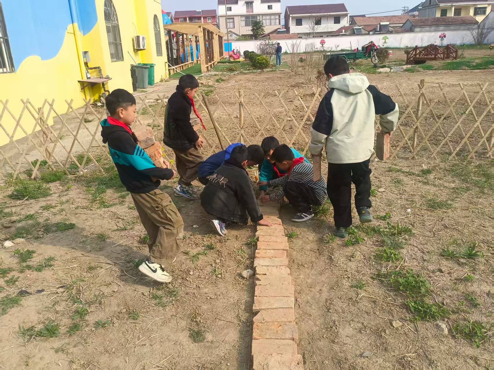 由科学课与美术课教师联合指导,学生分组绘制设计方案,最终选定“分区轮 作+生态围栏”方案。利用拆除旧围墙的残砖垒砌边界,废旧汽车轮胎刷漆后作为抬 升式种植槽,竹片编织成简易篱笆,实现零成本造景。